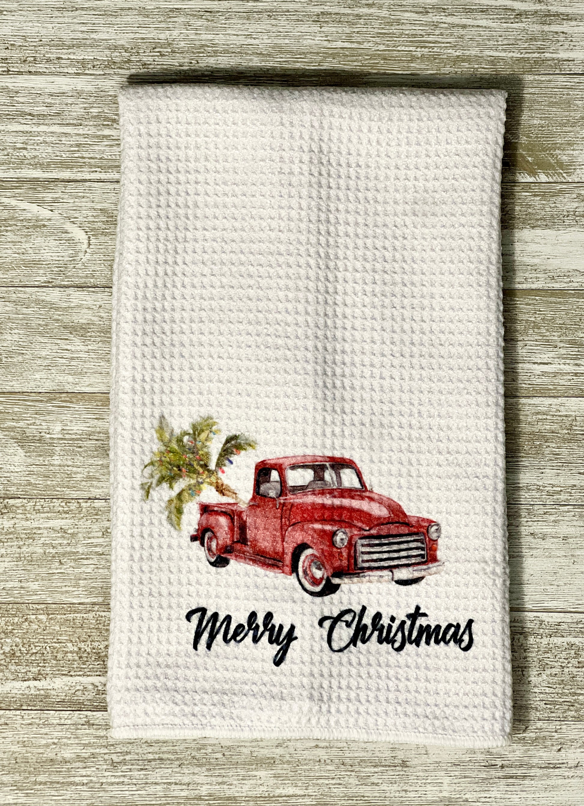 Antique truck with palm tree with Christmas lights in tow . These are soft waffle kitchen towels.