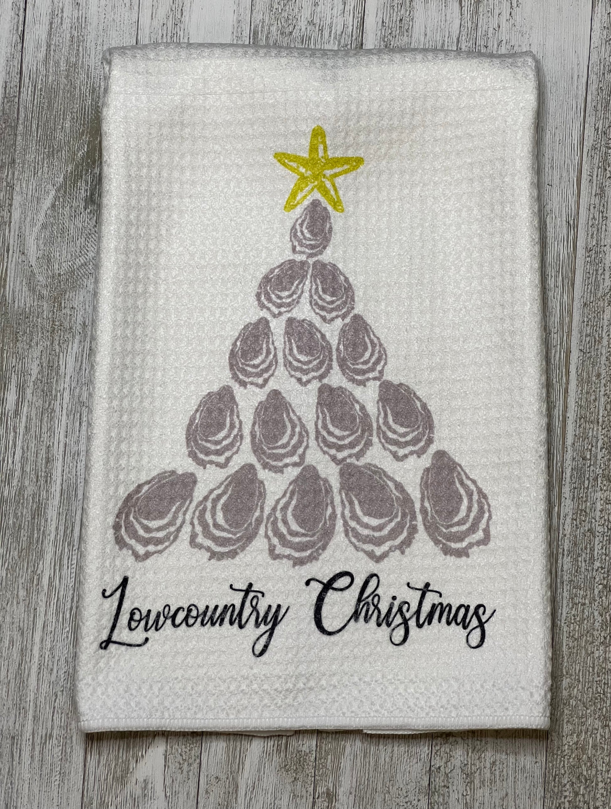 Fun and festive oyster Christmas tree waffle kitchen towel . Printed on soft waffle kitchen towels. Machine washable.