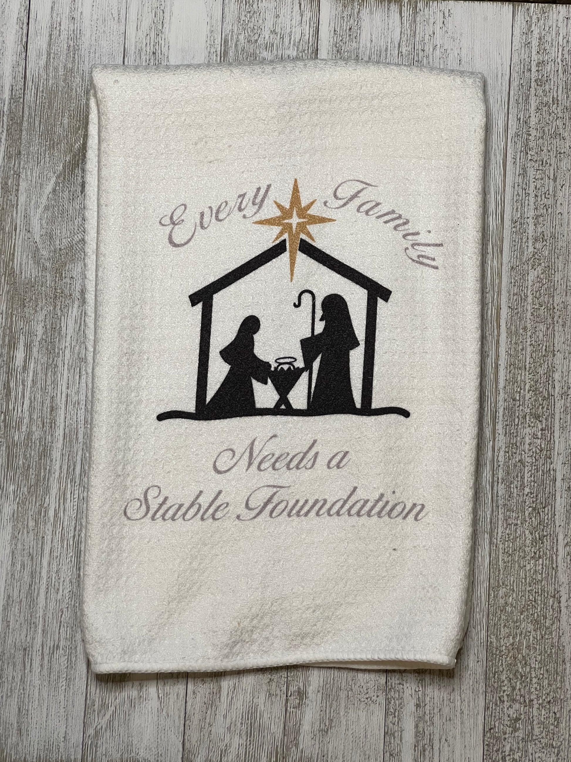 Every family needs a stable foundation. This is a printed on soft waffle kitchen towel. Machine washable.