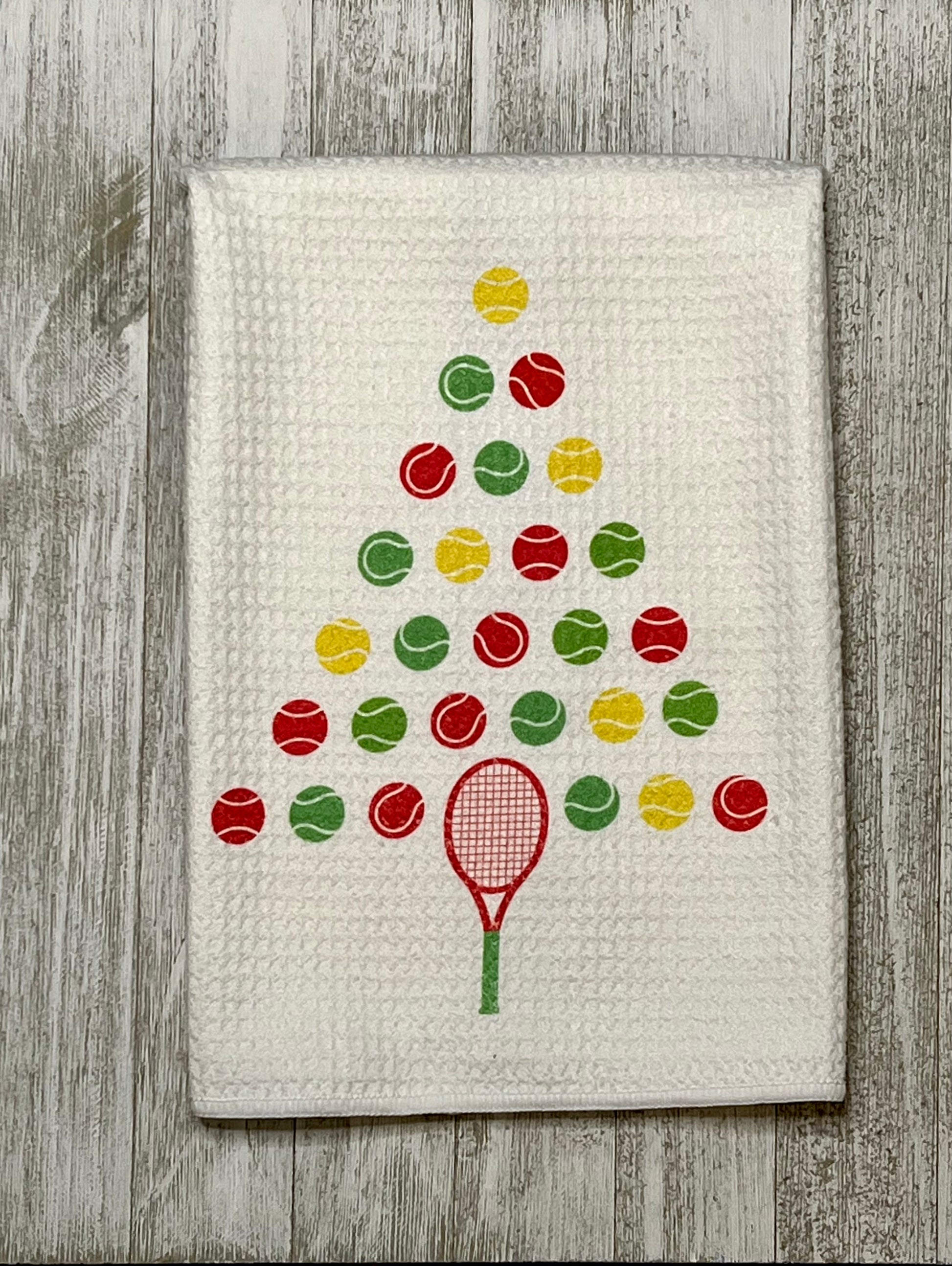 Fun and festive tennis ball tree kitchen towel. Printed on soft waffle kitchen towels. Machine washable.